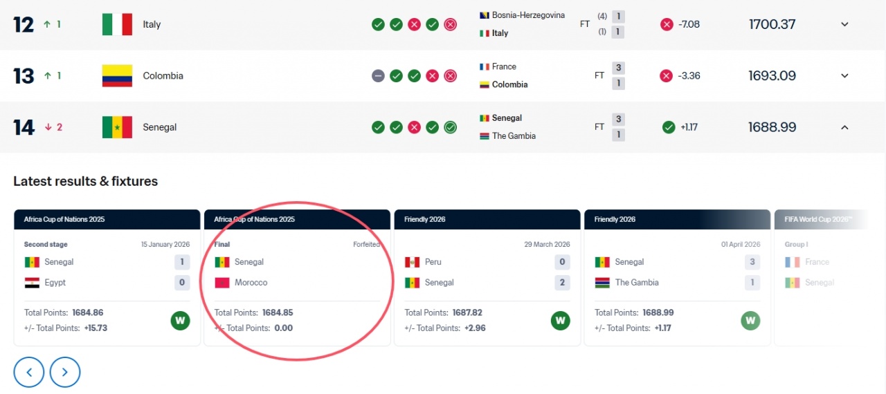 那又有吧友好奇了,那为什么国足在这次友谊赛中输球会被扣分,塞内加尔却没有因非洲杯决赛被判负扣分(显示为0分,而非负分)呢?