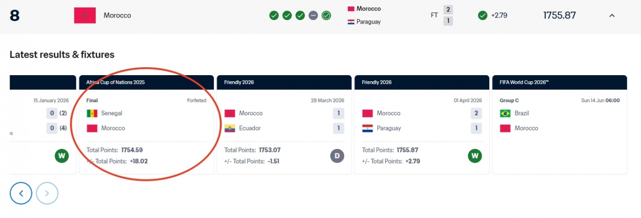 摩洛哥因为非洲杯决赛被判获胜,获得了18.02个积分。