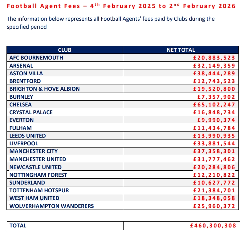 直播吧04月01日讯 英足总官方公布了2025年2月-2026年2月英超球队支付给经纪人的佣金,总计4.6亿镑,切尔西以6510万镑断层领跑。