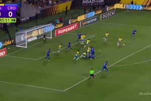 第45+2分钟,克罗地亚角球被解围,巴西后场库尼亚长传反击,维尼修斯跟进禁区左侧1对3盘带突破后扣球横敲,中路达尼洛跟进包抄入网!巴西1-0领先↓