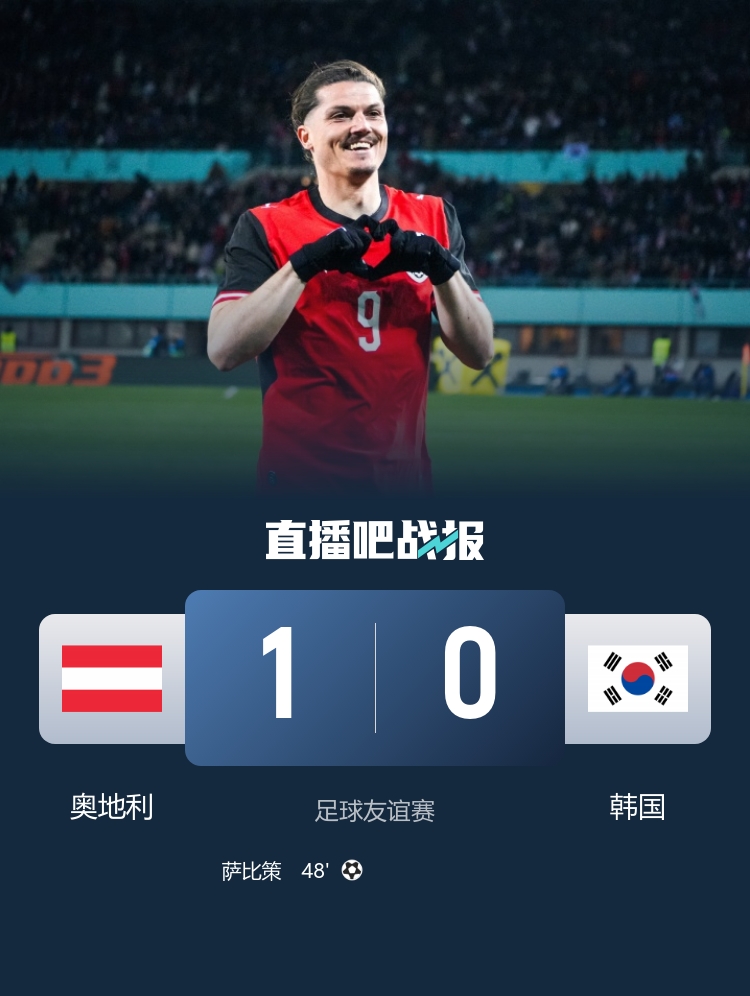 直播吧4月1日讯 直播吧4月1日讯 北京时间4月1日2:45,奥地利队在维也纳的恩斯特哈佩尔球场与韩国队进行友谊赛的角逐。上半场,孙兴慜、金玟哉先后造险,彭茨力保球门不失;下半场,萨比策扫射破门。最终奥地利以1-0击败韩国。