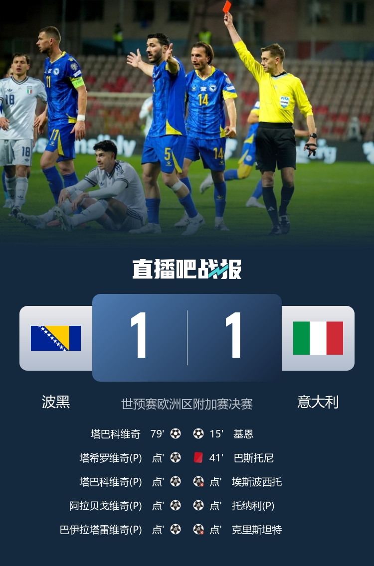 直播吧4月1日讯 北京时间2:45,世预赛欧洲区附加赛决赛波黑vs意大利,比赛在比利诺波耶球场打响!上半场,波黑门将送大礼,巴雷拉助攻基恩破门!多纳鲁马多次扑救;巴斯托尼最后一人犯规染红!下半场,基恩错失单刀良机!塔巴科维奇补射扳平!90分钟结束,十人意大利1-1波黑,加时赛双方均无建树,两队进入残酷的点球大战!点球大战中,埃斯波西托、克里斯坦特失点!最终,意大利1-1点球大战1-4不敌波黑,连续三届无缘世界杯!