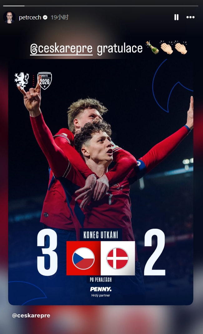 切赫写道:“祝贺捷克国家队🍾👏👏”