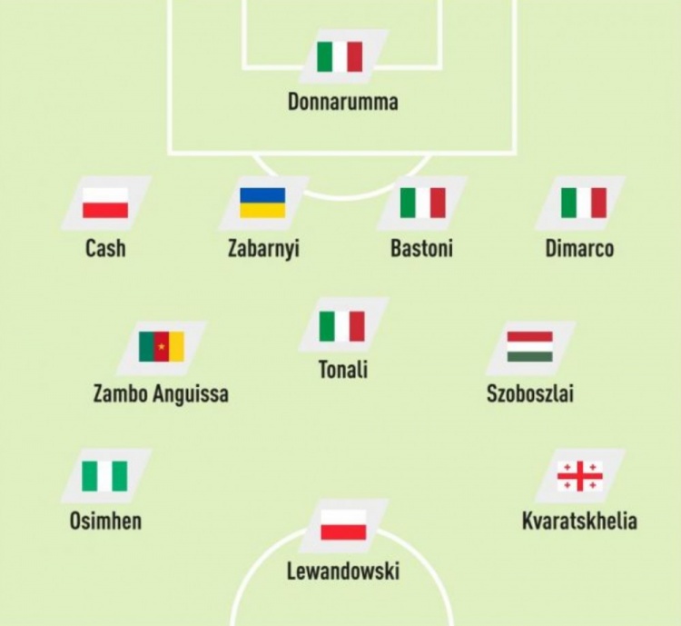 中场:安古伊萨(喀麦隆,那不勒斯)、托纳利(意大利,纽卡)、索博斯洛伊(匈牙利,利物浦)