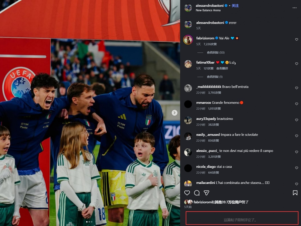 直播吧04月02日讯 世欧预附加赛决赛,意大利不敌波黑,无缘晋级2026美加墨世界杯。巴斯托尼本场染红,赛后他成为被指责的一大目标。赛后巴斯托尼没有更新社媒,他社媒最新一条还是附加赛半决赛晋级的内容。