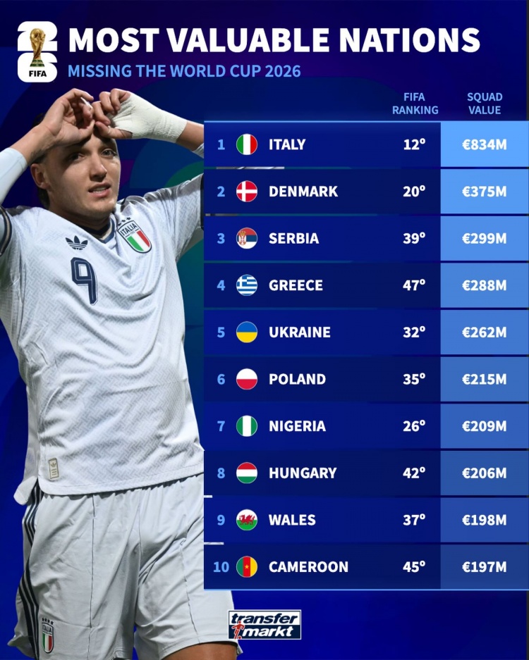 直播吧4月2日讯 德国转会市场列出了无缘世界杯球队身价排名,意大利8.34亿欧居首,丹麦、塞尔维亚二三位。
