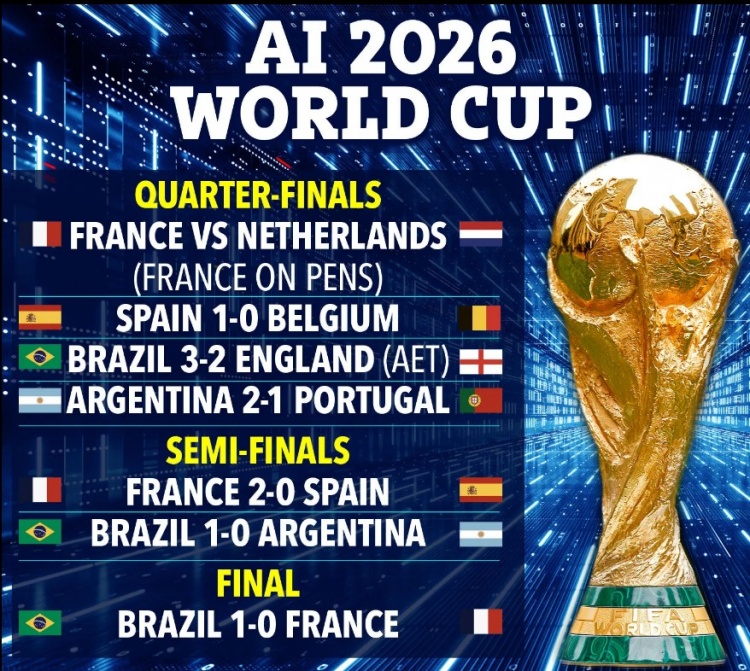 直播吧4月2日讯 根据AI预测,今年世界杯英格兰将在1/4决赛中被巴西淘汰,但本场比赛将被誉为本届赛事最佳比赛。另外,阿根廷将在1/4决赛中2-1战胜葡萄牙,但在半决赛被巴西淘汰,最终巴西将夺冠。