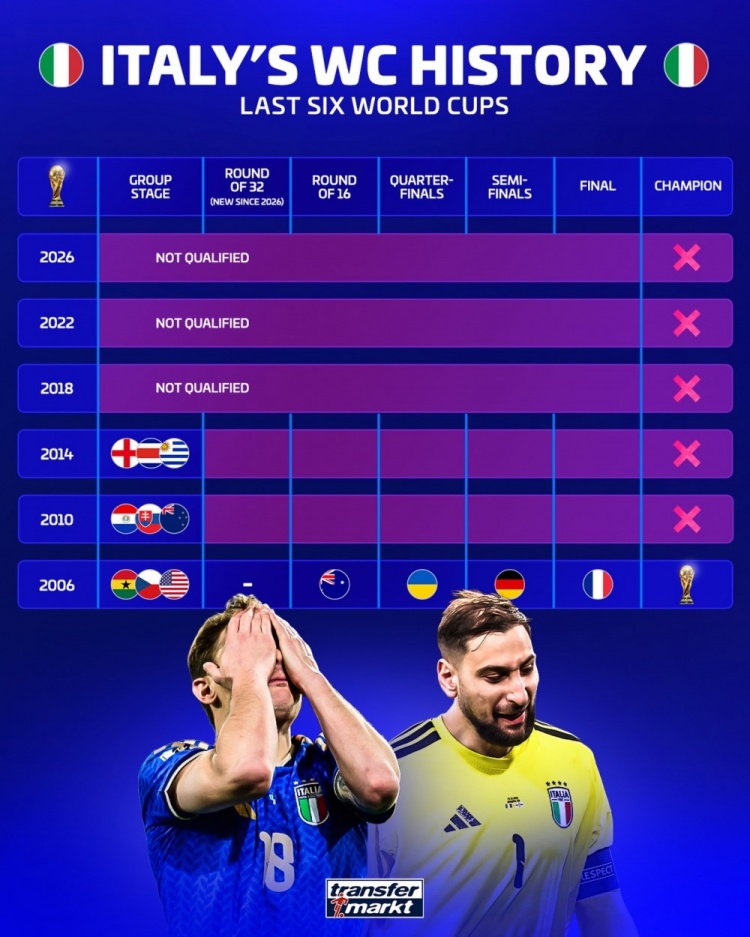 直播吧4月2日讯 世预赛附加赛决赛,意大利点球大战不敌波黑,连续三届无缘世界杯。德国转会市场盘点了2006年以来意大利的世界杯成绩。