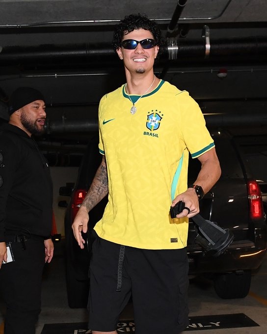 在勇士对阵马刺的比赛之前,效力于勇士队的巴西球员吉·桑托斯身穿巴西国家队球衣抵达现场,表达对桑巴军团的支持。