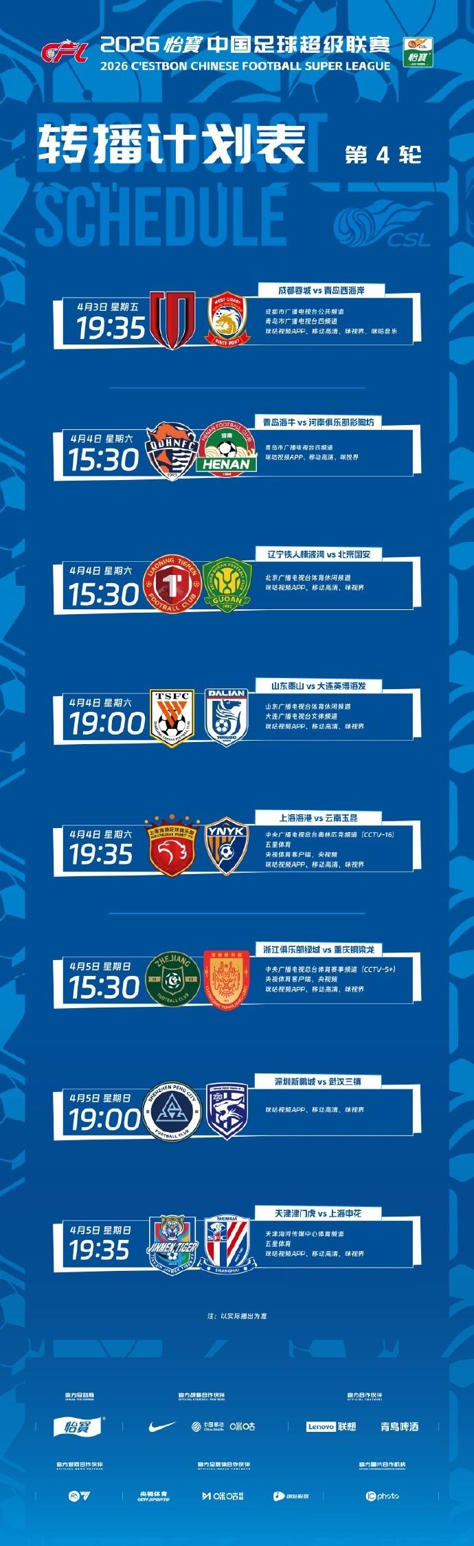 直播吧4月2日讯 中超第4轮将于4月3日-4月5日进行,中超官方公布本轮转播计划,CCTV16直播海港vs玉昆,CCTV5+直播浙江队vs铜梁龙。