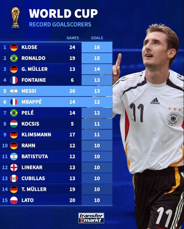 直播吧4月2日讯 德转列世界杯历史射手榜,克洛泽、大罗前二,梅西和姆巴佩分居第五位和第六位。