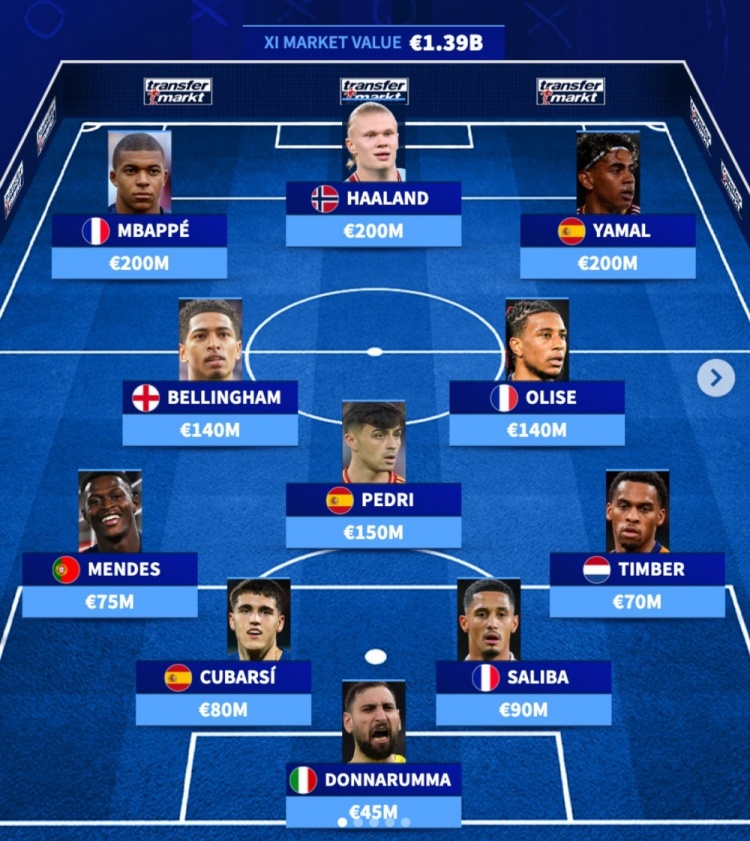 直播吧4月2日讯 在世界杯即将来临之际,德国转会市场盘点了欧洲最贵阵,姆巴佩、哈兰德、亚马尔三叉戟,佩德里、奥利塞在列。