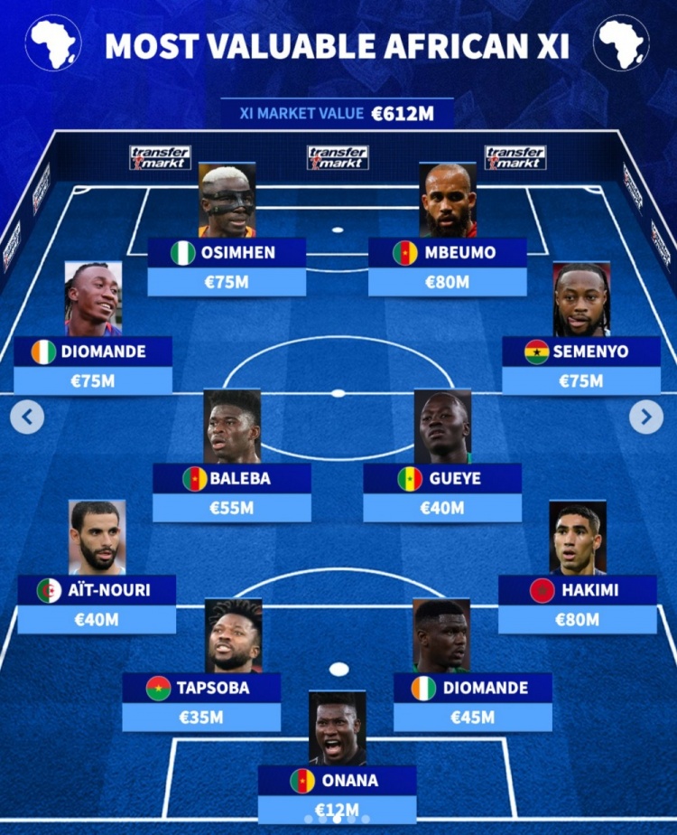 直播吧4月2日讯 德国转会市场盘点了非洲最贵阵,姆伯莫、奥斯梅恩双前锋,阿什拉夫、塞梅尼奥在列。