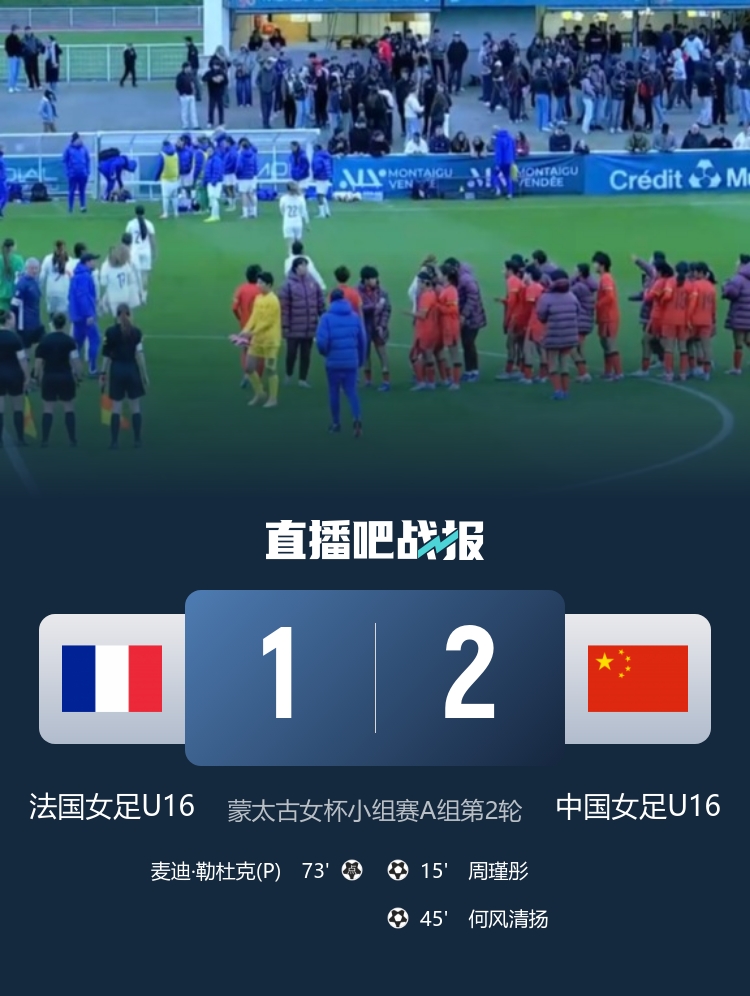 直播吧04月02日讯 北京时间4月2日00:30,蒙太古女杯小组赛A组第2轮,中国女足U16在法国马克西姆·博西斯体育场对阵法国女足U16。上半场,周瑾彤凭借任意球直接破门为中国队取得领先;下半场开场,何风清扬禁区内停球转身低射扩大比分,随后法国队依靠点球扳回一城。最终,中国女足U16 2-1击败法国女足U16。小组赛第三轮,中国女足U16将在北京时间4月4日00:30对阵墨西哥女足U16,法国女足U16则将对阵英格兰女足U16。