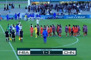 第15分钟,中国队获得前场任意球机会,周瑾彤主罚,皮球划出美妙弧线直挂球门死角,直接破门得分,中国女足U16 1-0领先法国女足U16。↓