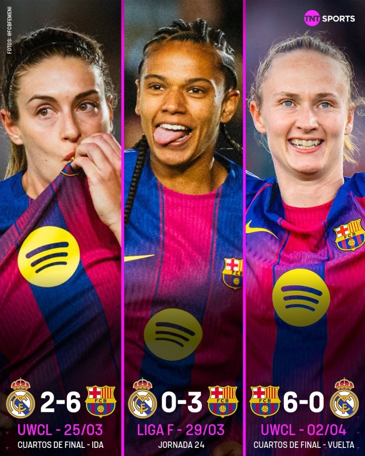 本赛季,双方之间已经有六次对阵,巴萨女足全部取胜,共进25球丢2球,实现了对皇马女足的赛季“六杀”: