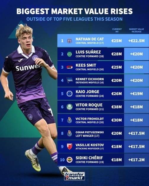 直播吧4月3日讯 德国转会市场盘点了本赛季五大联赛外球员身价涨幅情况,安德莱赫特小将德卡特+2250万欧居首,重返巴西踢球的罗克+1800万欧第6。