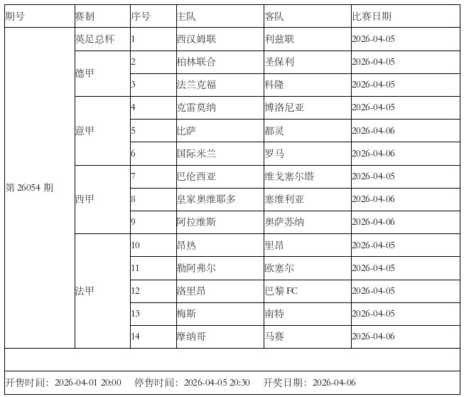 本周日传足胜负彩第26054期竞猜对象为英足总杯和德意西法联赛,其中西汉姆联将与利兹联争夺一个英足总杯四强名额,而国米将在主场迎战罗马,里昂做客昂热,马赛对决摩纳哥。