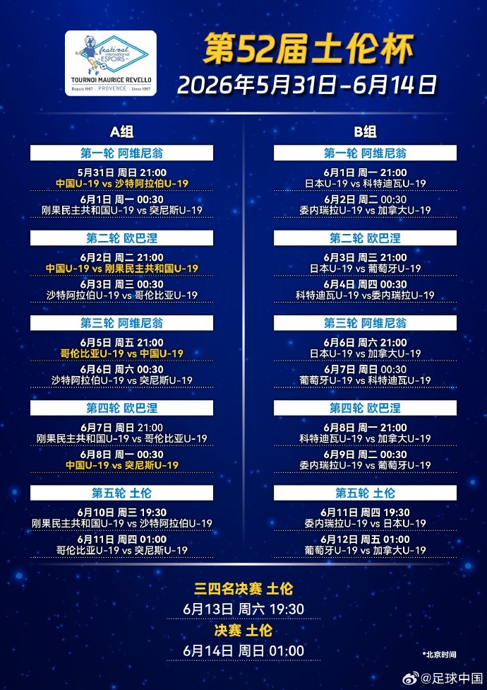 5月31日-6月14日,中国U-19国家男子足球队将于法国参加第52届土伦杯足球赛,与沙特阿拉伯U-19男足、刚果民主共和国U-19男足、哥伦比亚U-19男足和突尼斯U-19男足同在A组。