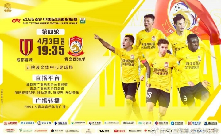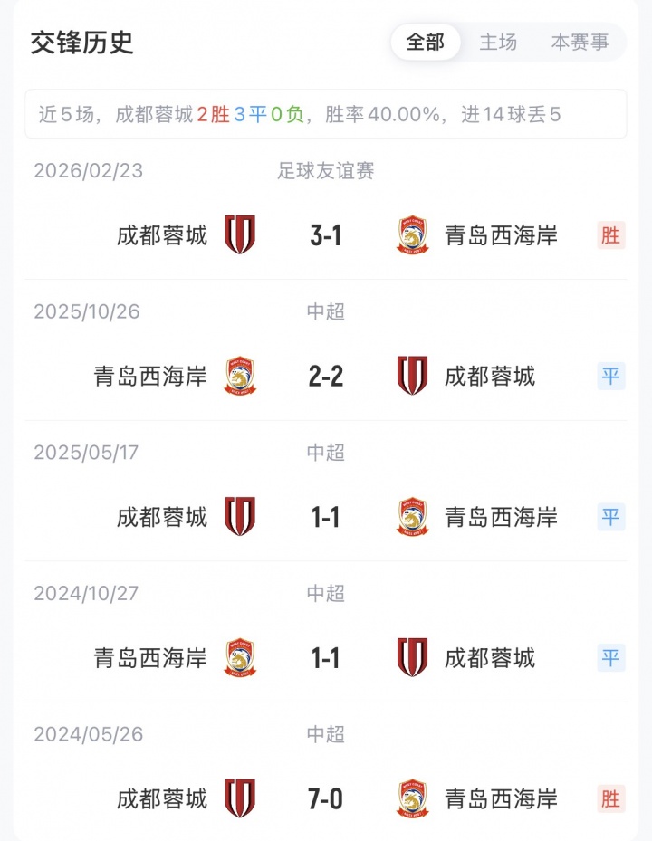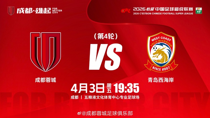 目前,蓉城2胜1平积7分位居中超第一;西海岸1胜2负积3分位列中超第七。双方近3次正式比赛交手三连平。