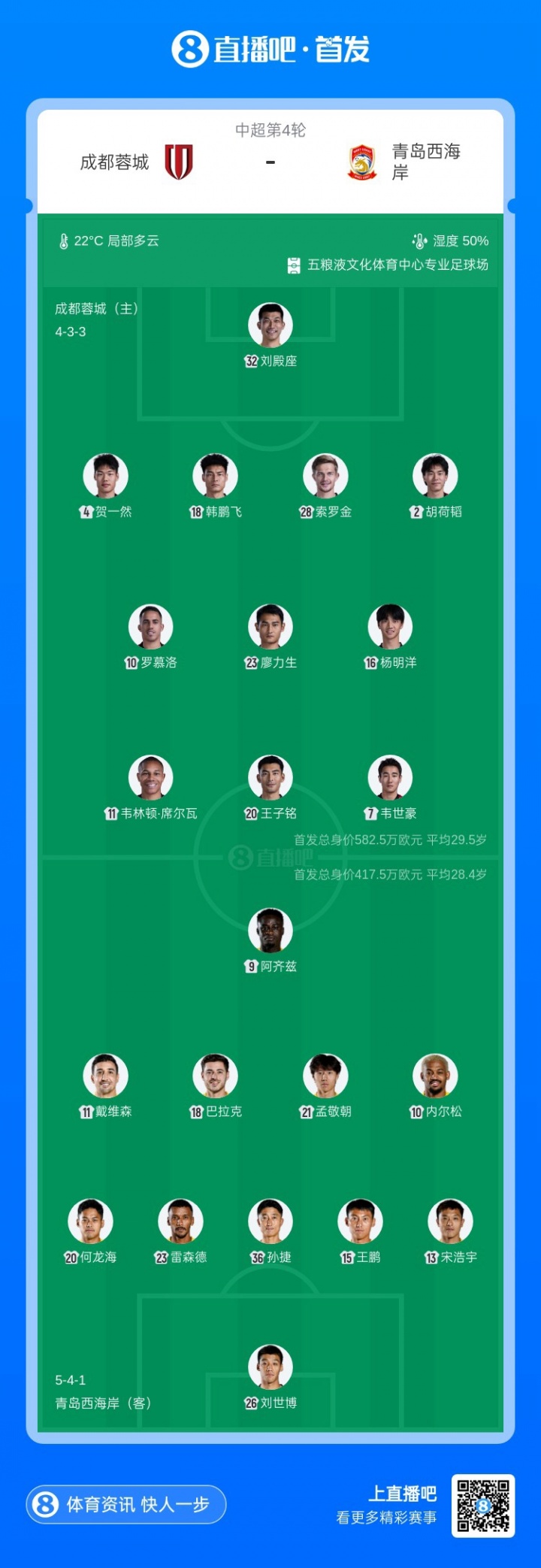 直播吧04月03日讯 北京时间19:35,中超第4轮,成都蓉城主场对阵青岛西海岸。赛前,双方首发出炉。【蓉城方面,韦世豪、罗慕洛、韦林顿先发,拜合拉木、费利佩替补;西海岸方面,戴维森、阿齐兹先发,彭欣力、艾菲尔丁替补】
