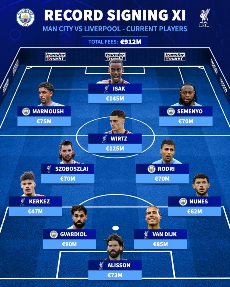 利物浦、曼城现役最贵签约阵容: