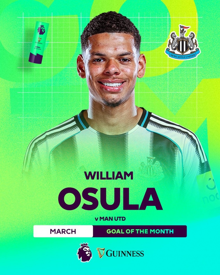 英超第29轮比赛,纽卡主场对阵曼联,第89分钟奥苏拉上演精彩一条龙,晃开马拉西亚兜射世界波破门,帮助纽卡2-1绝杀曼联。英超官方确认,他的这次长途奔袭当选3月最佳进球。
