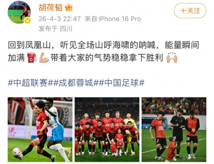 赛后为蓉城首发踢满全场的胡荷韬更新社媒庆祝胜利,他写道: