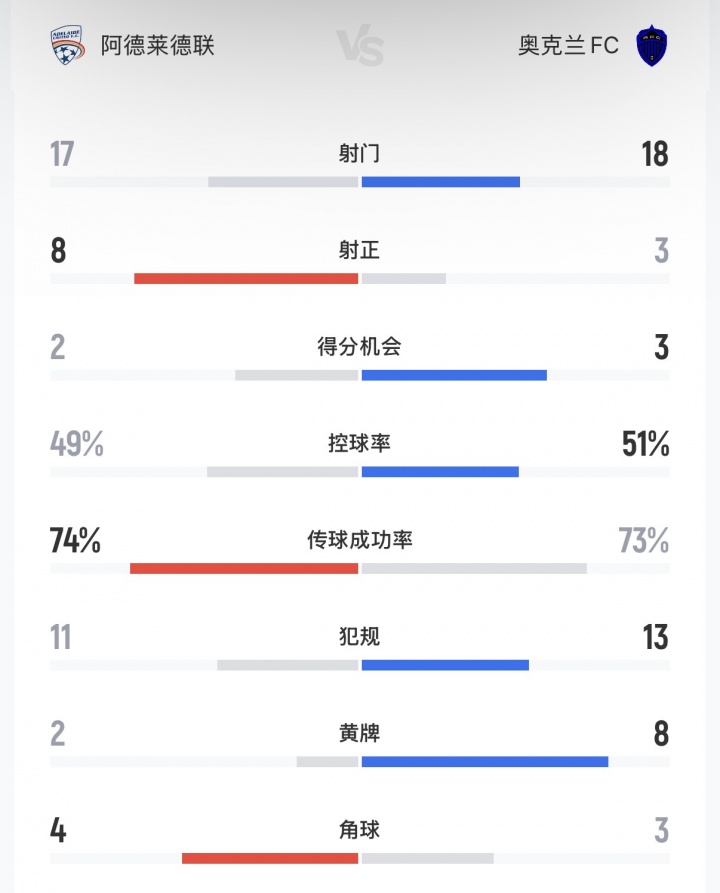 直播吧04月03日讯 北京时间16:35,澳超第23轮迎来一场强强对话,赛前积分榜暂排第4的阿德莱德联在主场库珀斯体育场对阵赛前暂排第2的奥克兰FC,上半场阿拉吉奇首开纪录,半场结束,主队阿德莱德联1-0奥克兰FC。下半场刚回来加列戈斯就打进一球为奥克兰FC扳平比分,此后两队再无进球,最终比分定格在阿德莱德联1-1奥克兰FC。