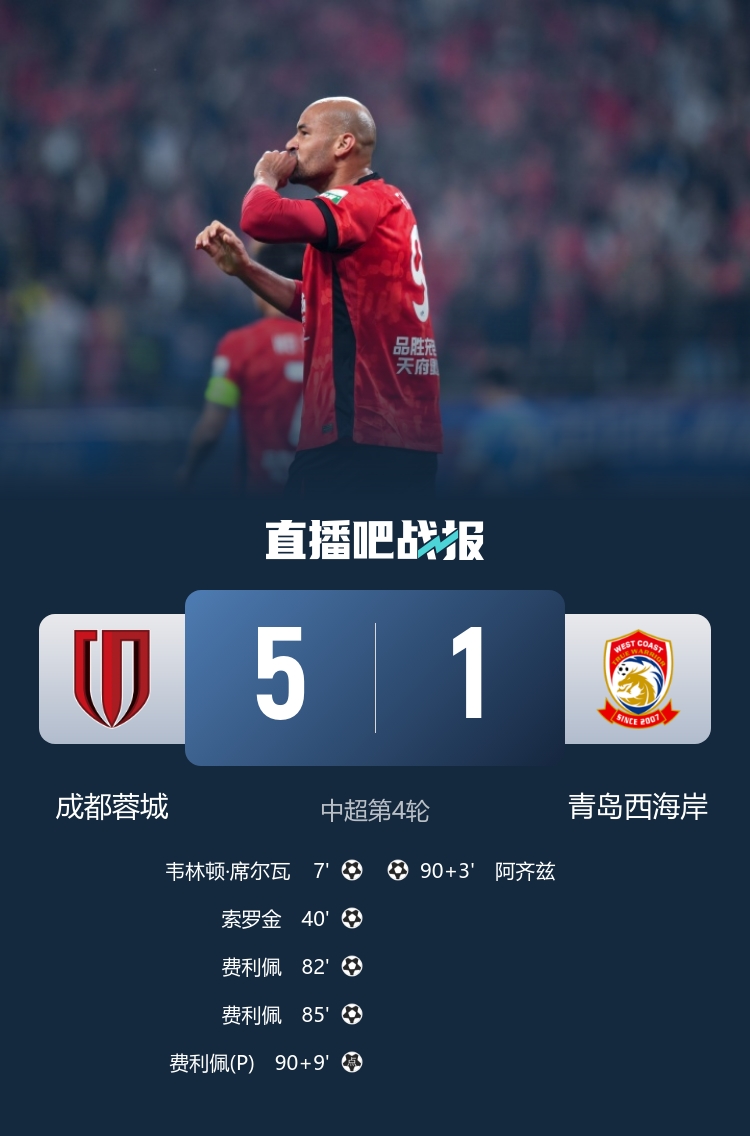 直播吧4月3日讯 北京时间4月3日下午19:35,中超联赛第4轮,成都蓉城坐镇五粮液文化体育中心专业足球场对阵青岛西海岸。上半场,韦林顿·席尔瓦凌空斩,索罗金补射得手。下半场,费利佩34岁生日夜替补登场上演帽子戏法,阿齐兹扳回一球。全场结束,成都蓉城5-1青岛西海岸。本场过后,成都蓉城3胜1平积10分继续领跑,青岛西海岸1胜3负积3分暂列第七。