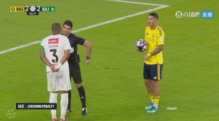 直播吧04月04日讯 沙特联第27轮,利雅得胜利对阵纳杰马体育。53分钟,C罗主罚任意球,对方球员禁区内手球,裁判判罚点球。