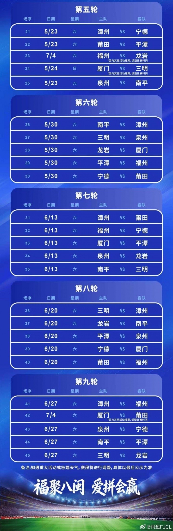 直播吧4月4日讯 2026年福建省城市足球联赛(闽超)常规赛赛程昨天发布。4月19日,揭幕战将在福州海峡奥体中心打响,由福州对阵厦门。据《厦门日报》报道,在全部487名报名球员中,厦门队的曾伟杰年龄最大,他出生于1981年8月30日。