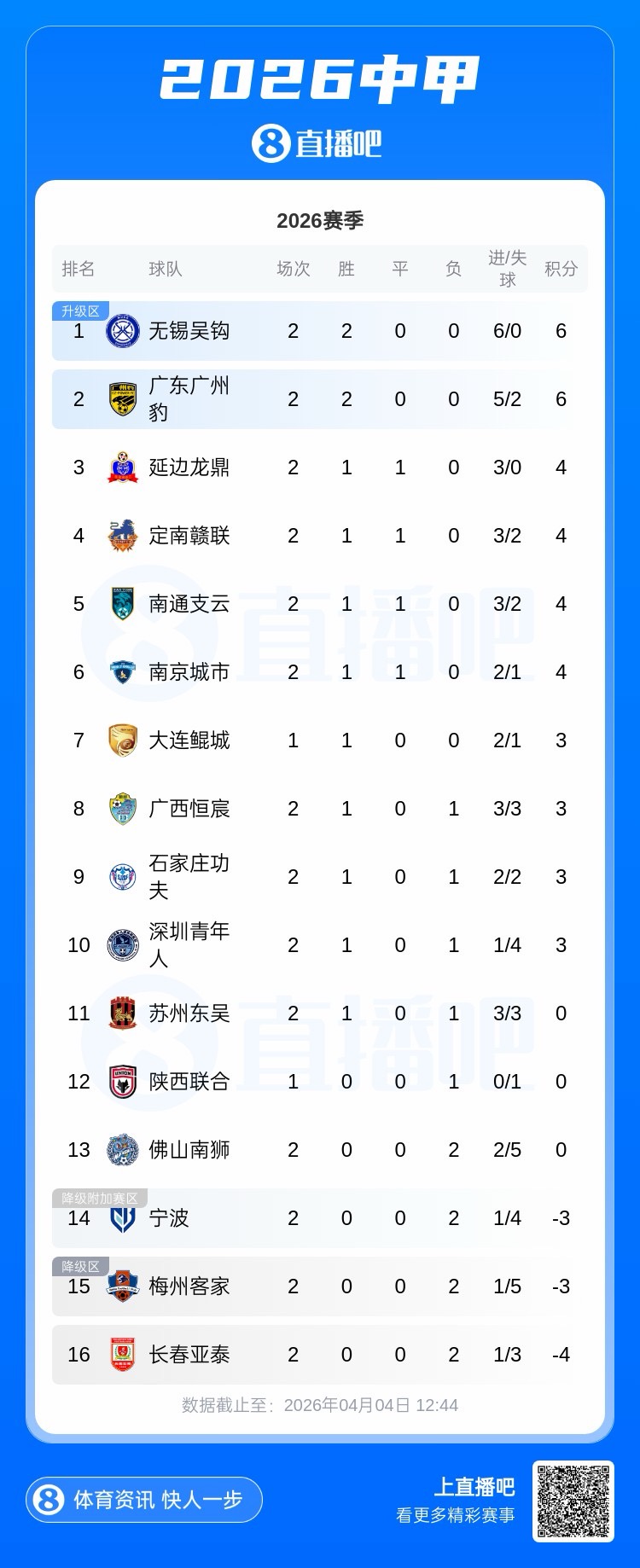 目前中甲2轮比赛过后,无锡吴钩以及广东广州豹皆2连胜积6分位列积分榜前2,而上赛季从中超降级到中甲的梅州客家以及长春亚泰则皆2连败排名积分垫底。