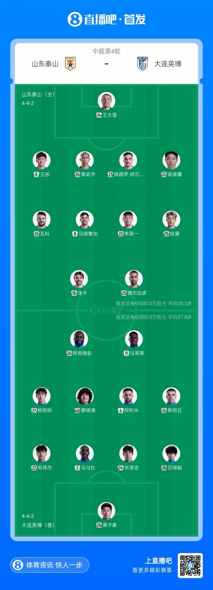 直播吧04月04日讯 19点中超第4轮,山东泰山主场迎战大连英博。【克雷桑此前缺席训练,本场缺阵,德尔加多先发。大连方面毕津浩首发战旧主,明天年满19岁的杨铭锐先发。】