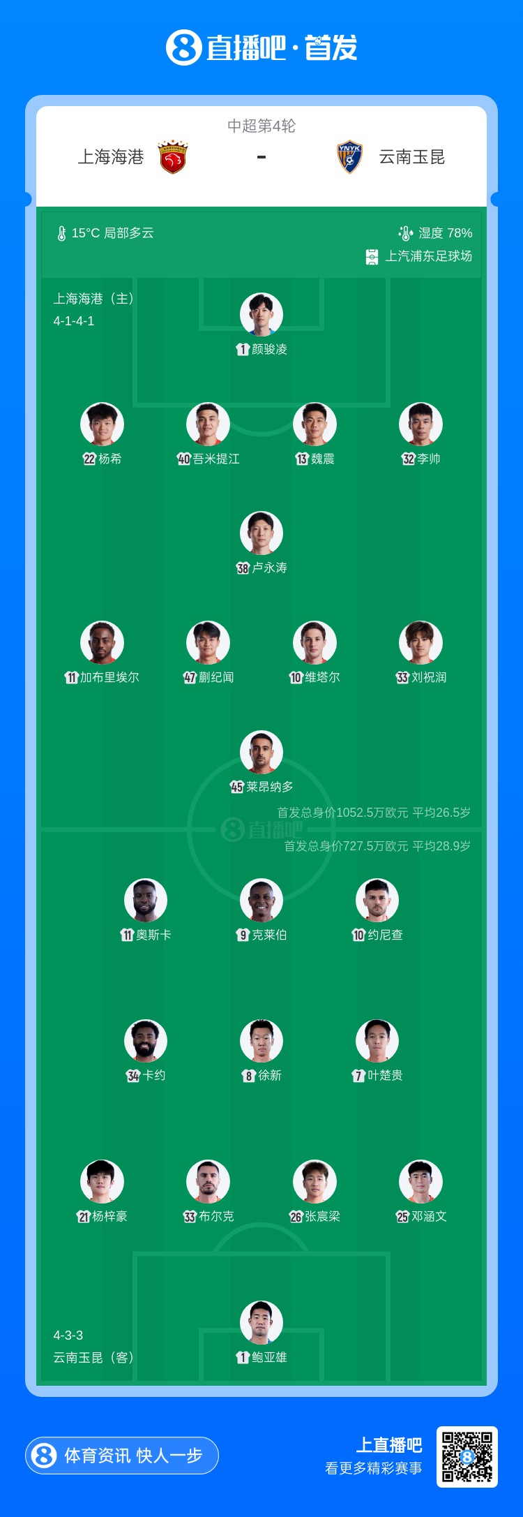 直播吧04月04日讯 北京时间今晚19点35分,中超第4轮,上海海港主场迎战云南玉昆,赛前双方公布首发阵容。海港方面蒯纪闻、卢永涛、杨希、刘祝润先发,克劳德、安佩姆因伤缺席;玉昆方面五外援悉数登场,徐新首发面对旧主。