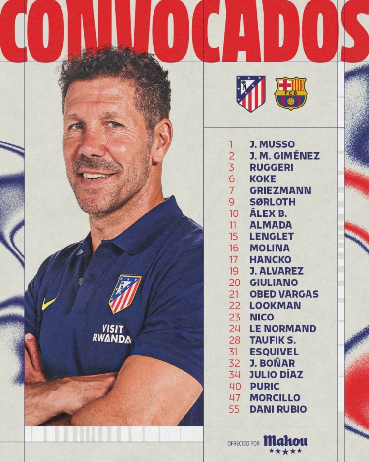 前锋:7-格列兹曼、9-瑟尔洛特、10-巴埃纳、11-阿尔马达、19-阿尔瓦雷斯、20-朱利亚诺·西蒙尼、22-卢克曼