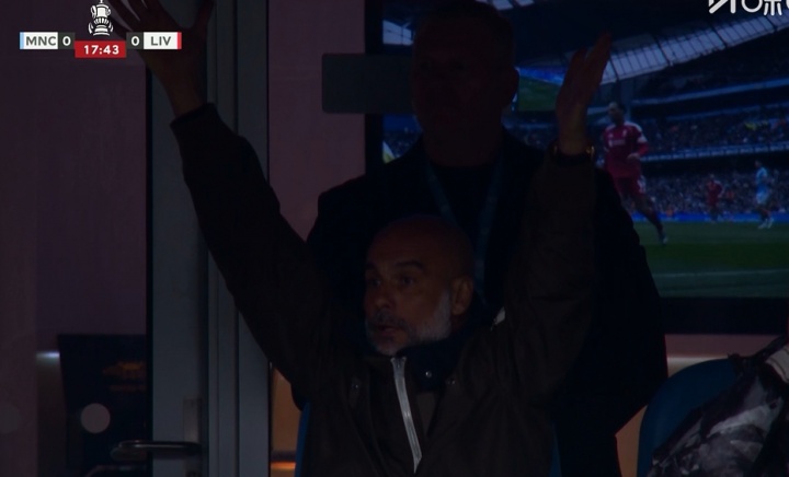 直播吧04月04日讯 足总杯1/4决赛,曼城坐镇主场对阵利物浦,上半场第18分钟,凯尔凯兹禁区内防守谢尔基,随后谢尔基在禁区内倒地,曼城球员索要点球未果,瓜迪奥拉在看台上举手表达不满。