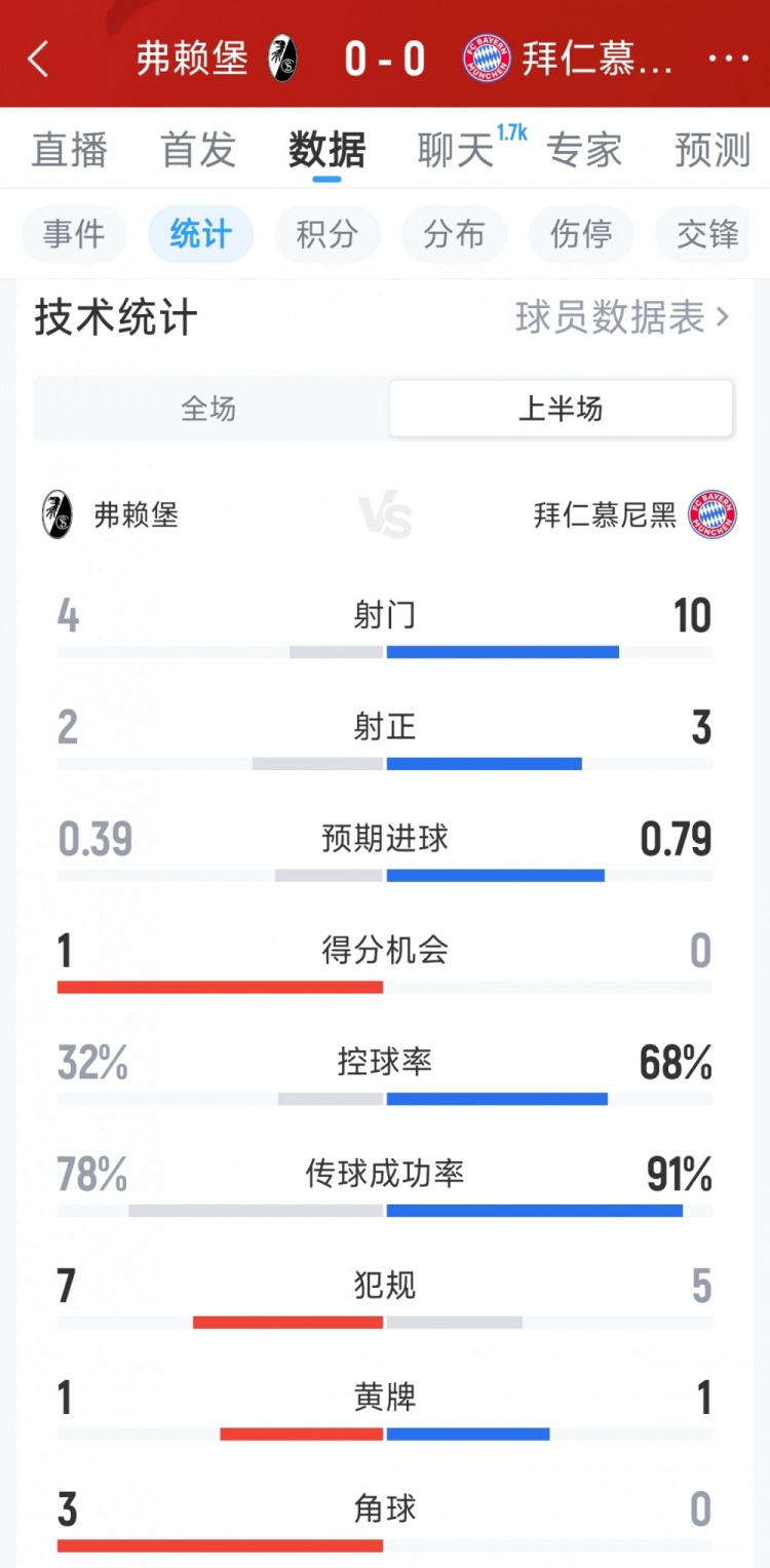 直播吧4月4日讯 本轮德甲拜仁对阵弗赖堡上半场战罢,双方暂时互交白卷,以下为双方半场数据对比:
