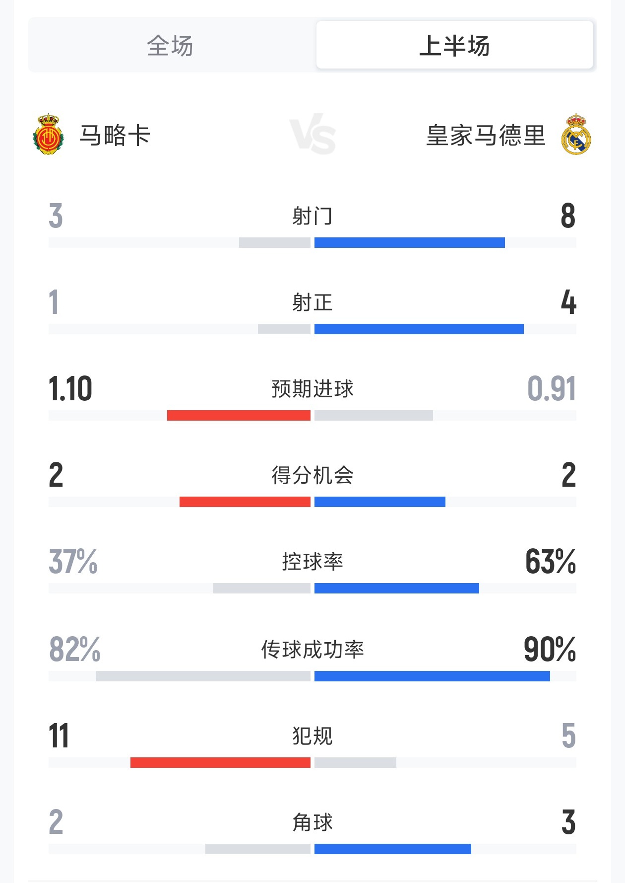 直播吧04月04日讯 西甲第30轮马略卡vs皇马上半场战罢,马略卡暂时1-0领先,以下为双方半场数据对比: