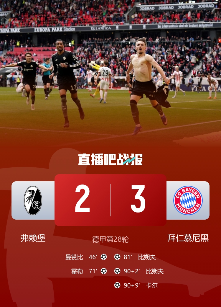 全场比赛结束,最终拜仁3-2弗赖堡。