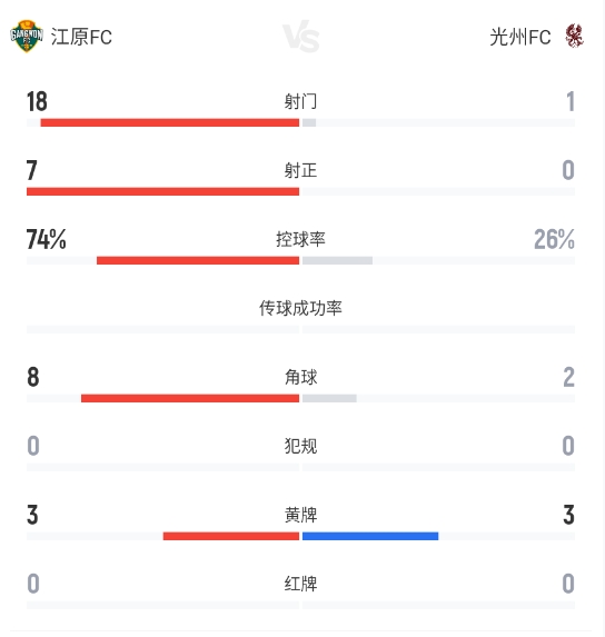 直播吧04月04日讯北京时间4月4日15:30K联赛第6轮江原FC坐镇春川松岩体育城迎战光州FC。上半场,开场仅10分钟,江原FC率先破门,随后牟在现帮助江原FC继续扩大优势,半场2-0结束。下半场李佑贤世界波破门,江原FC锁定本场胜局,全场3-0结束!