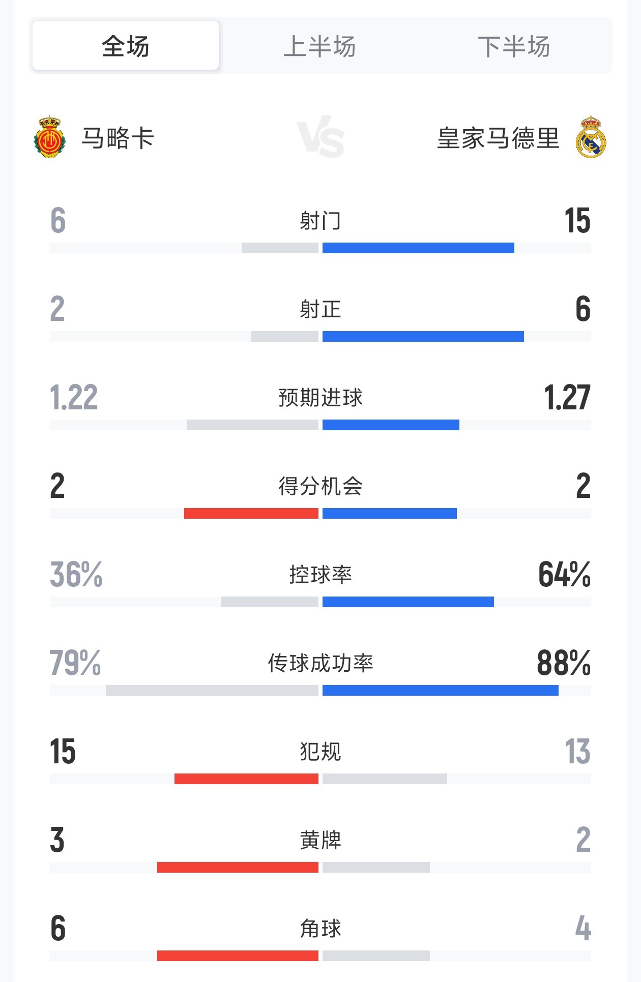 直播吧4月5日讯 西甲第30轮马略卡2-1皇家马德里,以下为双方全场数据对比: