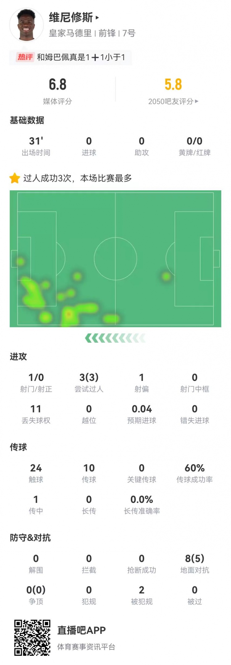直播吧4月5日讯 皇马在本轮西甲1-2客负马略卡,维尼修斯本场数据如下: