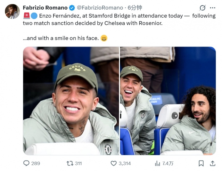 罗马诺晒照并写道:“在罗塞尼尔决定对他处罚两场禁赛后,恩佐今天来到斯坦福桥看球。”