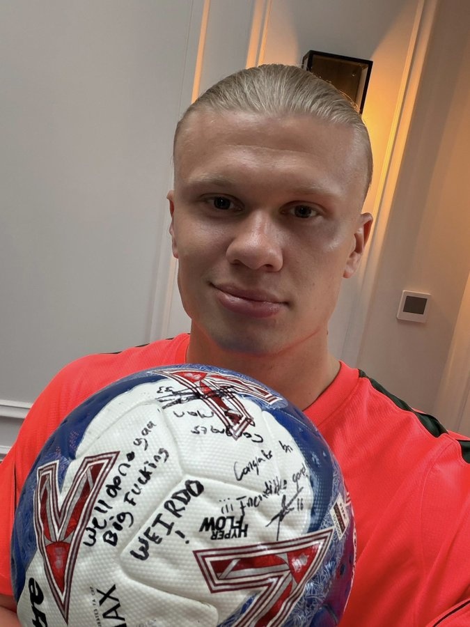 哈兰德社媒晒出比赛用球,队友贝蒂内利在球上面写道:“干得好,你个XX的大‘怪胎’!”