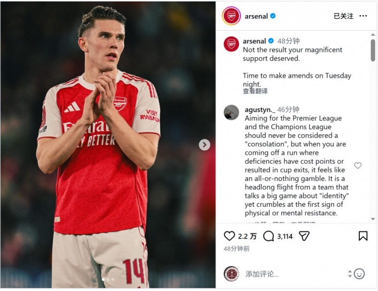 阿森纳官方社媒晒出球员们谢场的照片,配文:“你们的倾力支持没有换来应得的结果,周二晚上(客战葡体),我们会弥补这一切。”