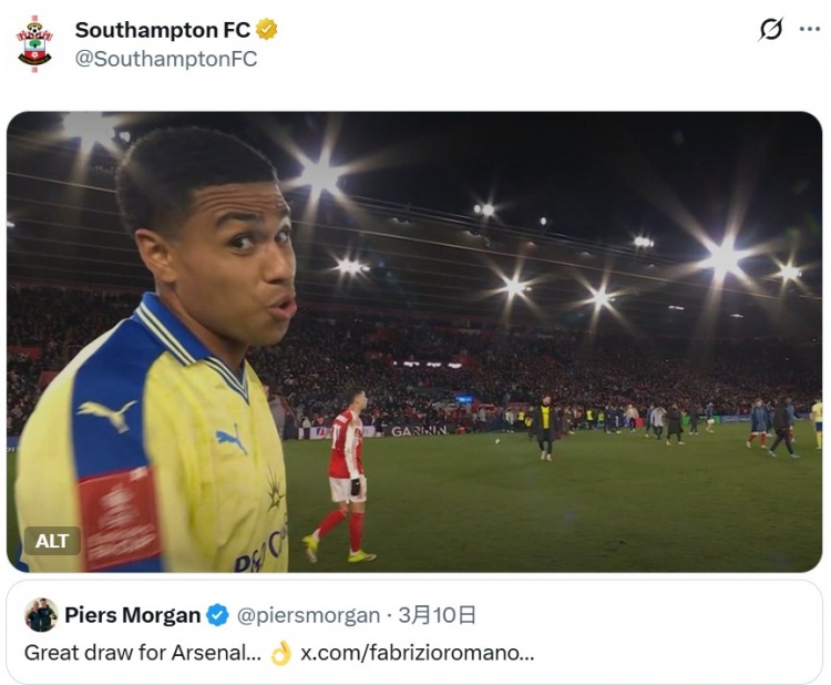 而南安普顿官方社媒也在本场比赛结束后转发了这一推文,并附上了进攻功臣谢赫·查尔斯的比赛照作为表情,其意味显然无需赘言。