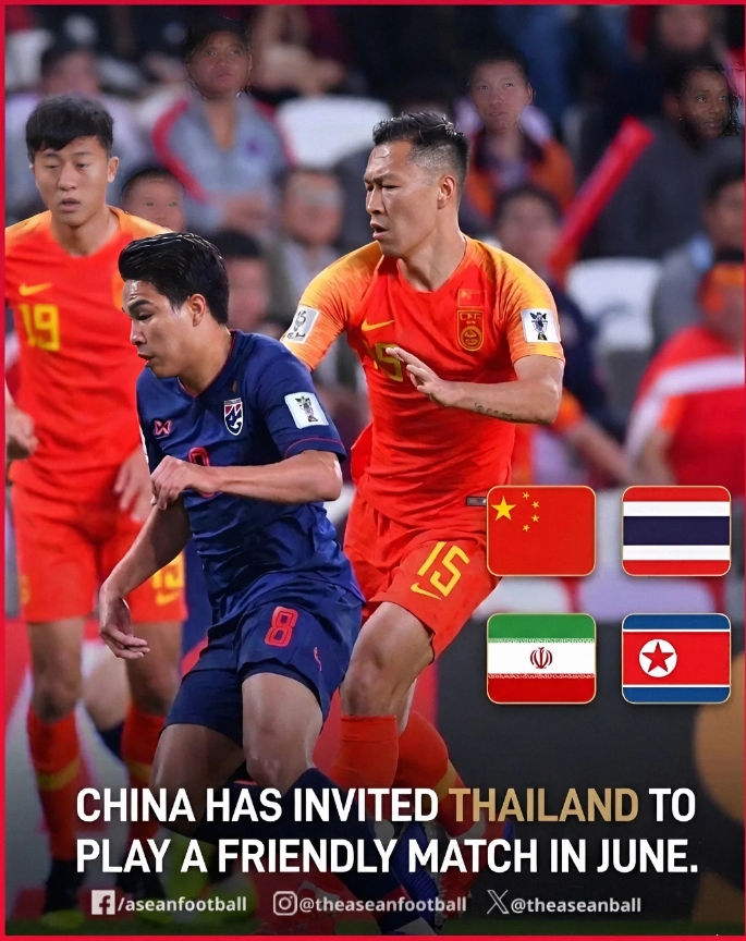 该博主表示,“中国足协已邀请泰国国家队参加将于6月举行的四队友谊赛,该赛事还将有伊朗队和朝鲜队参与,旨在为明年年初在沙特举行的亚洲杯做准备。参赛的四支队伍都已经获得了2027年亚洲杯的资格。”