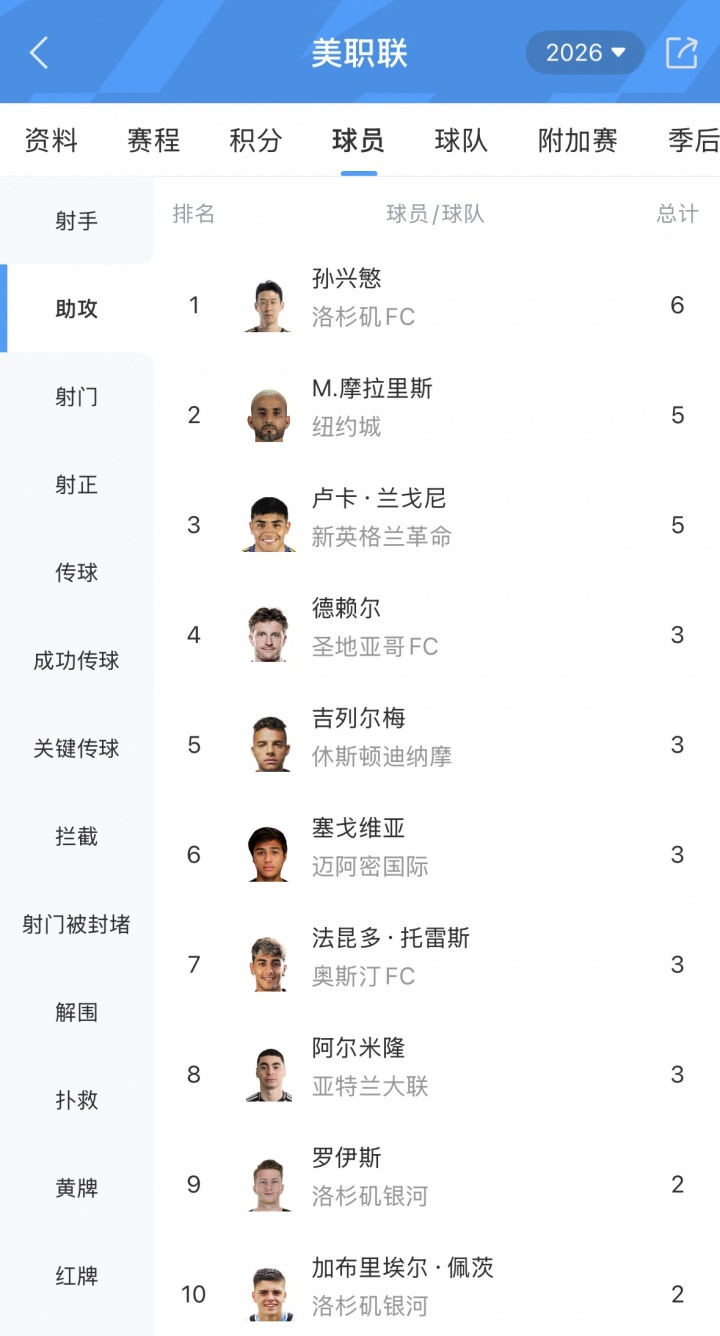 孙兴慜半场上演助攻大四喜,制造5球,本赛季10场1球10助,其中美职联收获6次助攻,登顶联赛助攻榜。