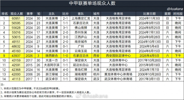 据朱艺统计,本场陕西联合观赛人数排名中甲历史第九,前八位均为大连英博。